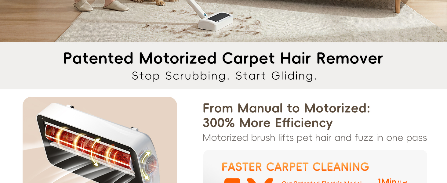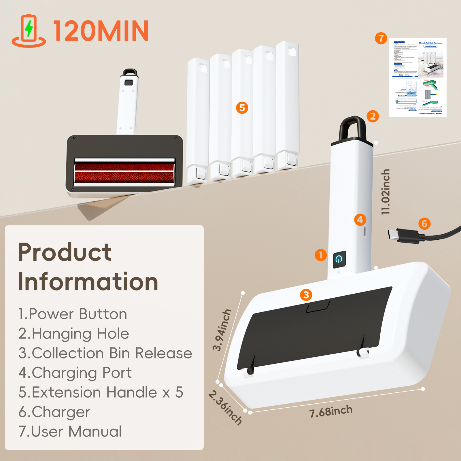 • PATENTED TECHNOLOGY: The first electric carpet hair remover with patented technology ensures premium quality and stable deep hair removal. Built-in high-capacity battery supports 120 minutes of continuous use on a single charge, enough for whole-house cleaning without recharging.